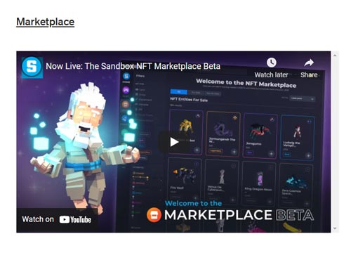 بازار NFT Sandbox به کاربران این امکان را می دهد که توکن های غیر قابل تعویض NFT خود را که با VoxEdit ساخته شده اند آپلود، منتشر و به فروش برسانند. این آثار ابتدا در یک شبکه IPFS آپلود میشوند تا یک فضای ذخیرهسازی غیرمتمرکز فراهم کنند. سپس برای اثبات مالکیت در بلاک چین ثبت میشوند. پس از انجام این کار، به دارایی تبدیل می شوند که می توانند با ارائه یک پیشنهاد فروش اولیه در بازار، جایی که خریداران بالقوه می توانند آن ها را خریداری کنند، فروخته شوند.