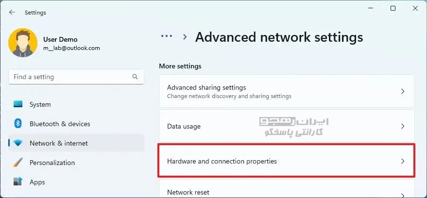 ۴- در بخش «More settings»، روی تنظیمات «Hardware and connection properties» کلیک نمایید.